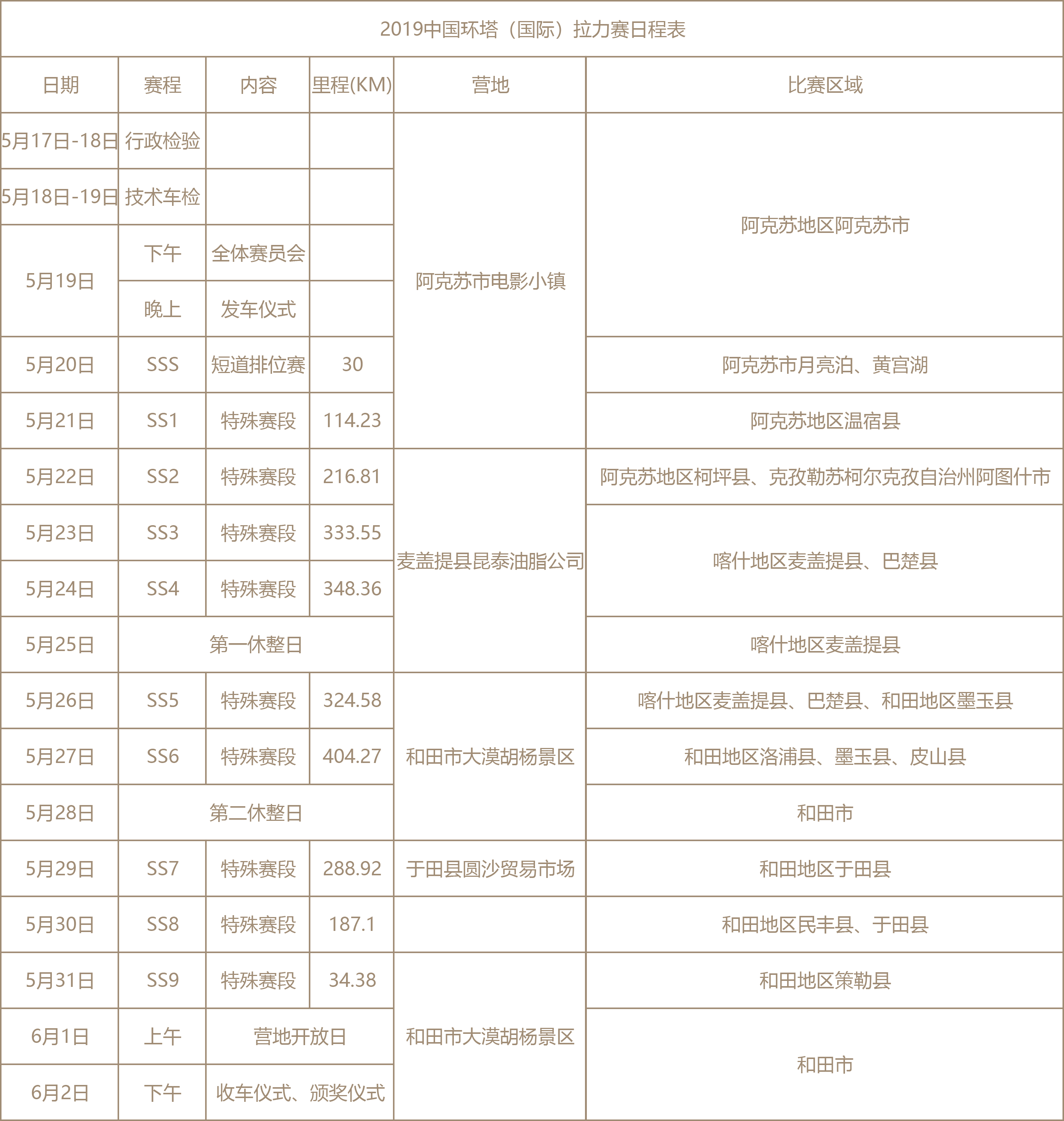 2019年環(huán)塔拉力賽將于5月17日至6月2日拉開新賽季的戰(zhàn)幕,歷時15天,全賽程預(yù)計5000公里,共為9個賽段,4個大營,分別為阿克蘇、喀什、于田以及和田。其中特殊賽段2500公里,沙漠比例將超過50%,特別設(shè)置了一個高達3100米的高海拔賽段,這是環(huán)塔歷史上第一次,也是近年來難度最高的一次。賽事從阿克蘇地區(qū)阿克蘇市開幕發(fā)車,途徑阿克蘇地區(qū)、克孜勒蘇柯爾克孜自治州、喀什地區(qū),最后在和田地區(qū)和田市閉幕收車。賽段涵蓋峽谷雅丹地貌、塔克拉瑪干沙漠腹地、戈壁及昆侖雪山等極具新疆特色的地形地貌,整個賽程將會給車手們帶來全新的挑戰(zhàn)。